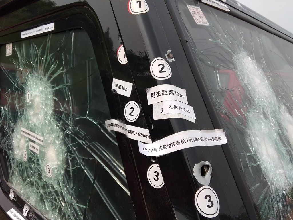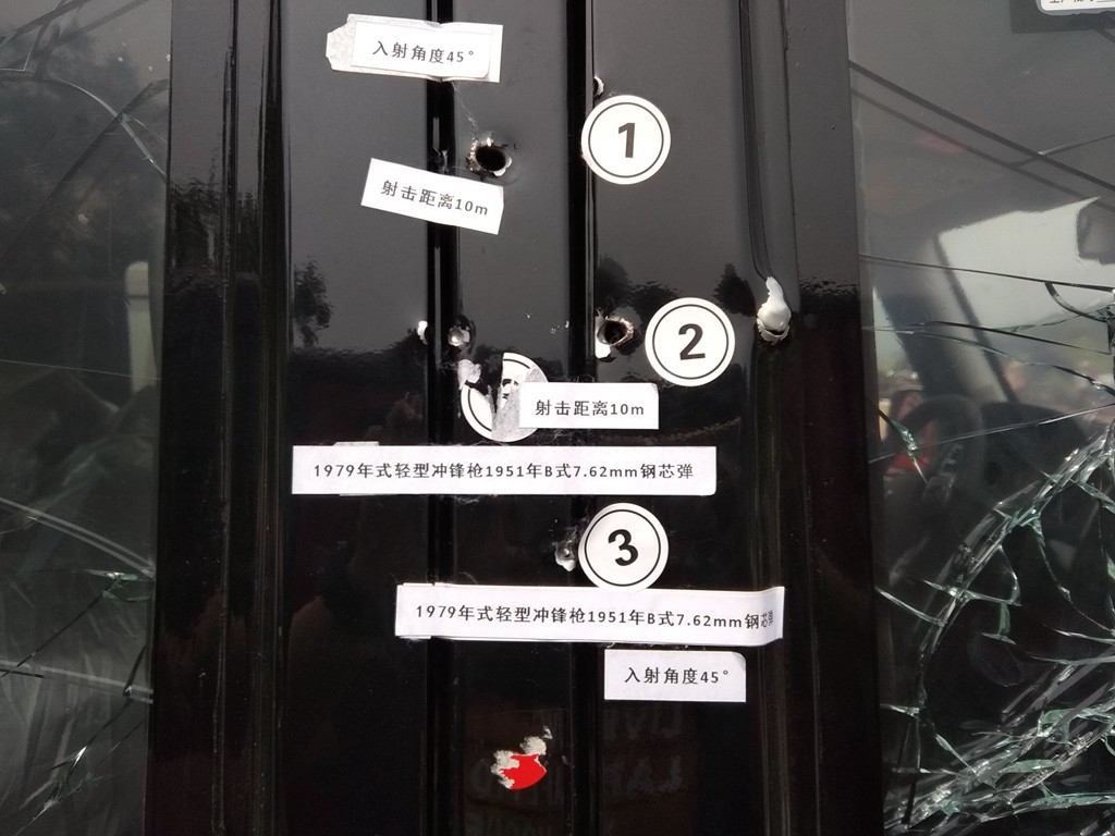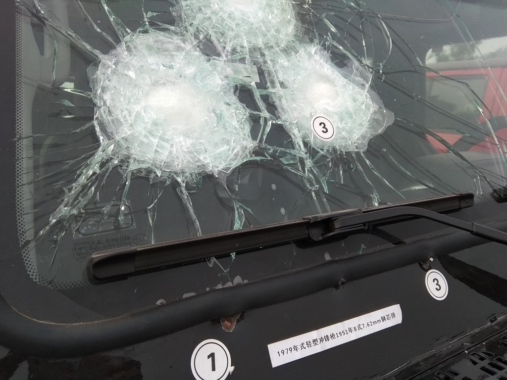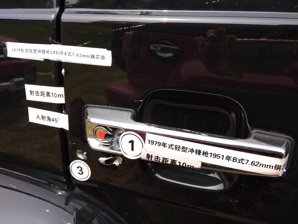 再查看车身侧面情况,玻璃同样被打花,但在79式冲锋枪的扫射下,玻璃仍未破碎,车内人员性命无忧。