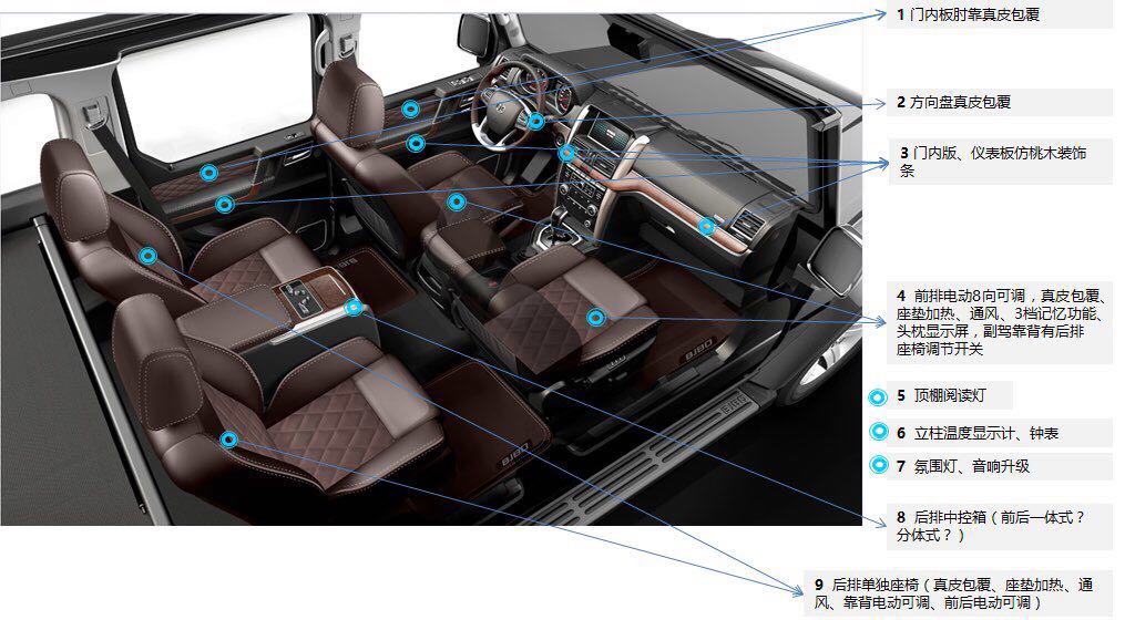 进入车内完全不是一般军车那样的粗糙感,真皮座椅、木纹饰板、镀铬饰条等多种材质搭配,内部设计更加时尚,档次提升却很实用。