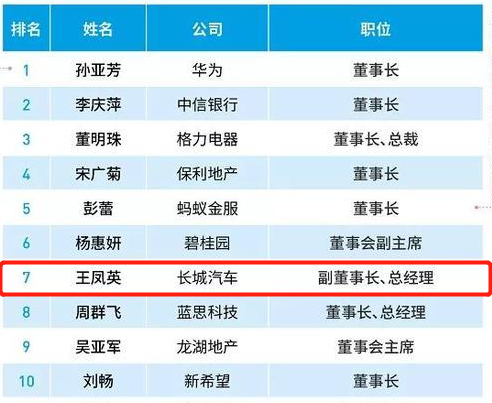 王凤英,1991年就进入长城汽车即开始从事营销,并且仅仅在试用了1到2个月就直接当上了营销公司销售经理助理,2001年起担任长城汽车销售有限公司总经理,2003年任长城汽车股份有限公司总裁至今。如此强大的能力确实配得上“商界木兰”这个称号。