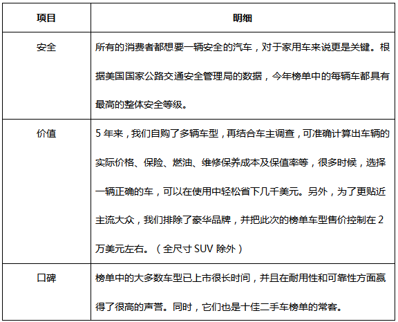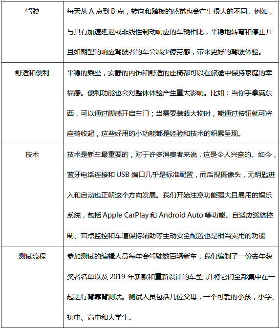 为了进一步理解,下表为2019年《凯利蓝皮书》家用车主要评选标准(车载娱乐译制):