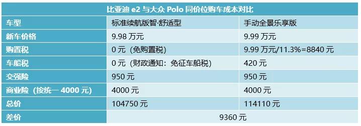 比如前段时间球叔就去试驾了比亚迪e2和大众Polo,印象相当深刻。比亚迪e2售价8.98-11.98万元,大众Polo售价9.99-12.39万元。先不说产品体验的巨大差异,单就两款产品的购置成本就有比较大的区别,比亚迪e2作为新能源车享受着免购置税和免车船税政策,这项费用大概可以节省7947元到10602元。