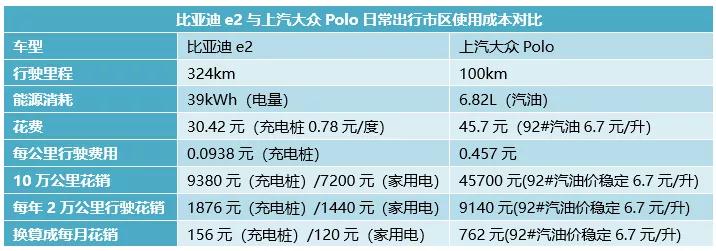 用车成本更是让人惊讶:比亚迪e2跑324公里实际花销30元,而大众POLO要达到148元