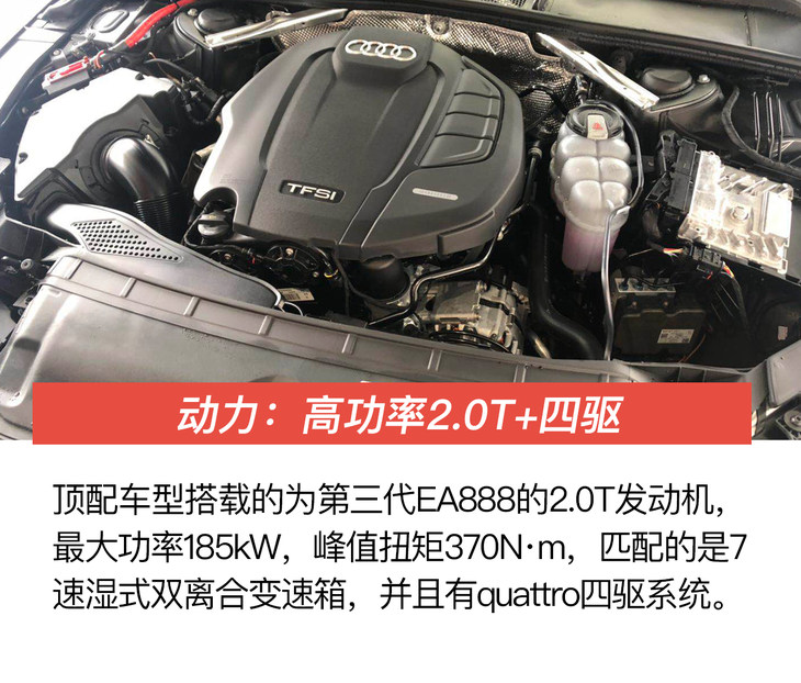 动力方面,新款奥迪A4L依旧搭载2.0T发动机,分为三种不同功率调校,本次拍摄的车型为2.0T高功率版,最大功率185kW,峰值扭矩370N·m,匹配的是7速湿式双离合变速箱,并且有quattro四驱系统。不过,2.0T低功率版的A4L也增加了四驱版车型,让消费者有了更多的选择。
