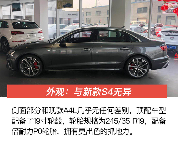 侧面部分,中期改款的A4L尺寸并没有太大的变化,侧面线条也非常流畅。新车相比老款车型而言换装了19寸轮毂,并且配备了245/35 R19的配耐力P0轮胎,整体的性能没得说,前面四活塞刹车卡钳保证了出色的制动性能。