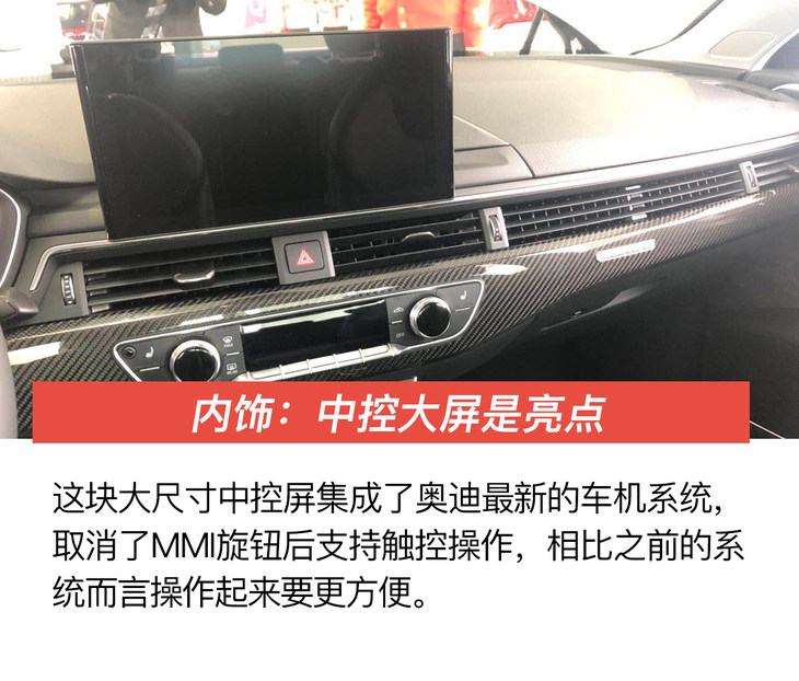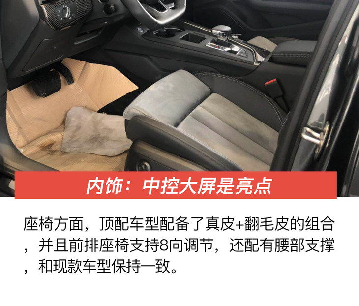 这块大尺寸中控屏支持触控按压功能,整体操作起来相比此前的MMI旋钮更方便了一些。顶配车型还配备了座椅加热功能,并且中控台上面的装饰板为仿碳纤维纹路,相比铝饰板看上去要更运动一些,同时也区分了各个配置车型的差异。