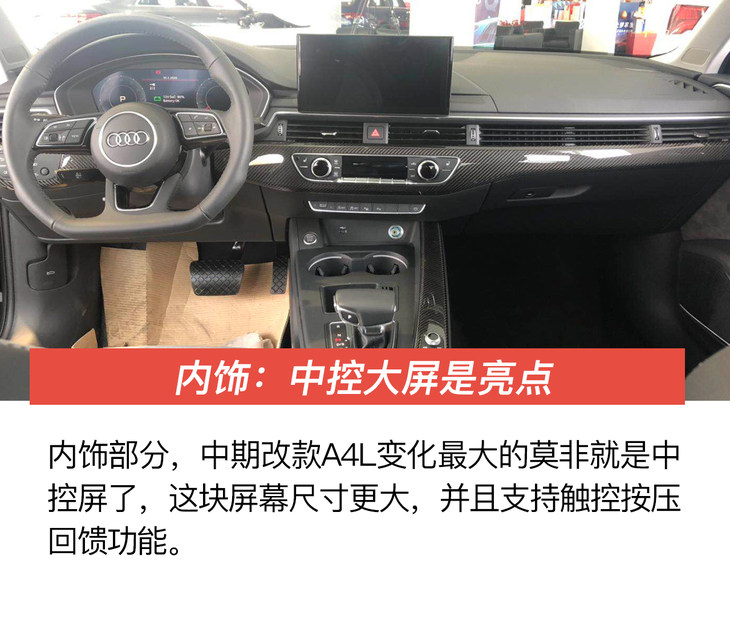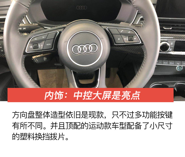 内饰部分,新车内饰设计基本和老款保持一致,只不过新车换装了大尺寸中控屏,并且原有的MMI旋钮被一个小的储物格代替。此外,三幅式方向盘样式没有变化,主要的变化在于上面的多功能按键。