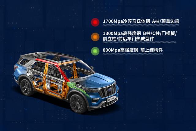 最近消费者因为中保研的碰撞测试对车辆A柱的强度格外注意,全新第六代福特探险者的A柱和顶盖边梁采用世界上抗拉强度最高的冷淬马氏体钢,强度高达1700兆帕,这相当于指甲盖大小的面积就可以承受17吨重量。